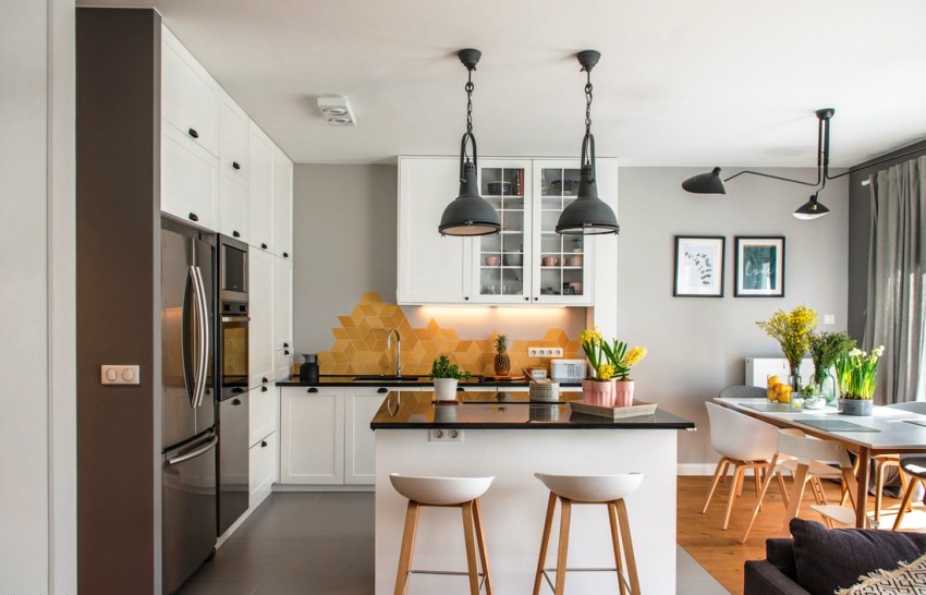 الأجهزة المنزلية المصنوعة من الفولاذ المطلي بالكروم ونفس الحنفيات وأحواض المطبخ وأرجل الأثاث المعدنية في تناغم مثالي مع مزيج الألوان هذا. تتناسب الأسطح ذات طباعة الصور بالأبيض والأسود تمامًا مع الداخل. يمكن أن تكون النغمات الرمادية والصفراء ناجحة بنفس القدر في تزيين الجدران. الشيء الرئيسي هو نسبتهم النسبية.