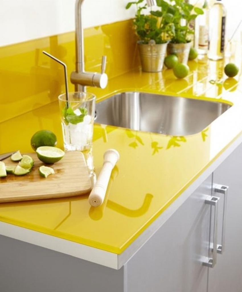 - بينما يعتبر اللون الأصفر من أخف درجات اللون ، إلا أنه يعتبر عمليًا. بفضل هذه الخاصية ، يوصى بتزيين سطح عمل سطح العمل والمئزر ، مما سيساعد في جعل المطبخ الصغير أكبر قليلاً.