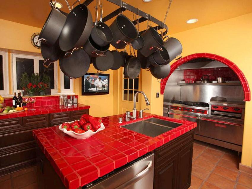 يمنح اللون الأحمر اللون الأصفر الداخلي لمسة من الشرق. ومع ذلك ، يجب أن يكون اختيار ظلال القرمزي شديد الحذر.من الأفضل أن تبرز بعض العناصر الساطعة على خلفية ذات لون أصفر أكثر هدوءًا. هذه العناصر هي التي ستجذب انتباه أولئك الذين يأتون إلى المطبخ في المقام الأول.