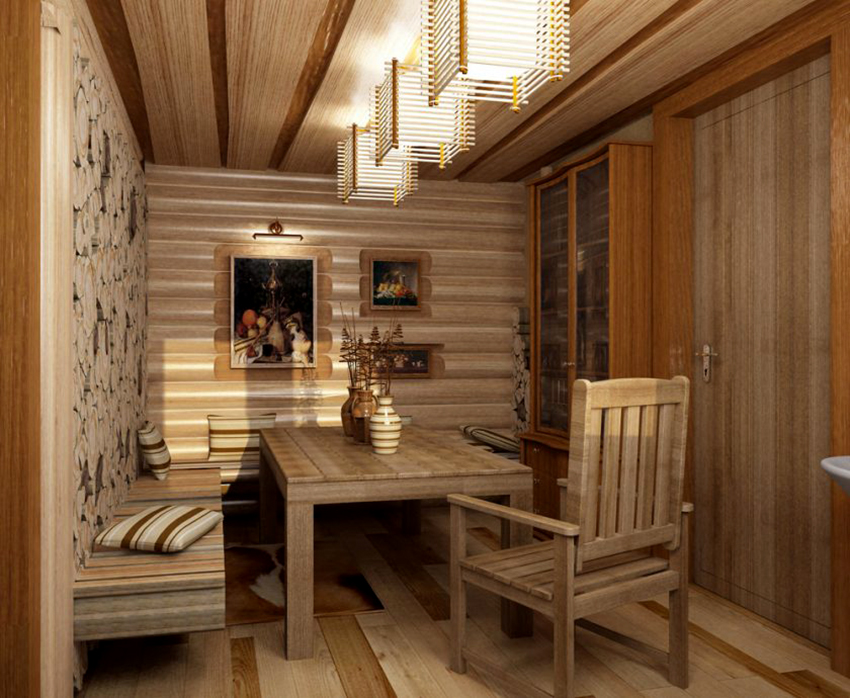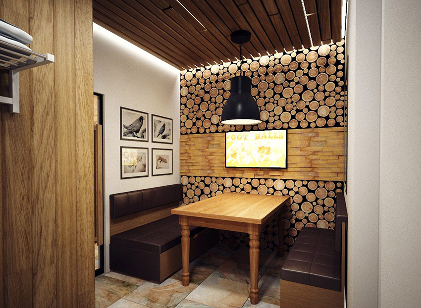 لجعل الانطباع العام عن الحمام ممتعًا ، من الضروري إنشاء تصميم داخلي مثير للاهتمام بالفعل في غرفة ارتداء الملابس. من المستحسن صنع أثاث من نوع واحد من الخشب. في غرفة خلع الملابس ، سيكون خشب الصنوبر غير المكلف مقبولًا تمامًا. يجب أن تكون المفروشات الرئيسية بنفس اللون. يمكنك استخدام ظلال أخرى ، ولكن فقط لتزيين قطع فردية من الأثاث.