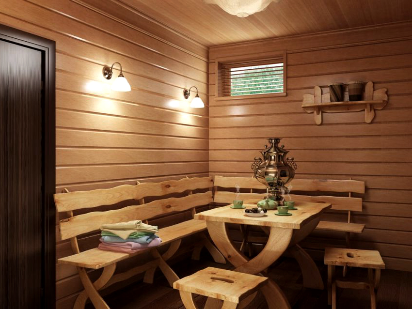 الراحة في الحمام لها اختلافات كبيرة عن الراحة في أي غرفة أخرى: حالة جسدية خاصة ، والرغبة في التواصل ، وعدم الرغبة في التقاعد. وبالتالي ، تحتاج غرفة الاستراحة إلى طاولة وكراسي (أو أثاث جلوس آخر) يجمع الجميع معًا على فنجان من الشاي. مطلب إلزامي: يجب أن يكون سطح هذا الأثاث مصقولًا تمامًا حتى لا يشعر الجسم بعدم الراحة عند لمسه. من الضروري أن تسمح أبعاد سطح العمل بتركيب مآخذ مع المربى والعسل ، وكذلك السماور - وهي سمة أساسية للحمام الروسي الحقيقي.
