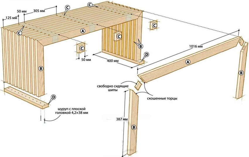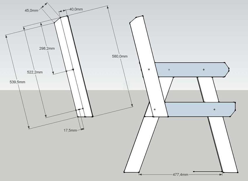 - يجب قطع الألواح وقضبان التثبيت ومساند الذراعين والقوائم والأرجل الأمامية بزاوية 90 درجة. يتم وضع الحزم بزاوية 45 درجة. الأرجل الخلفية - بزاوية 11 درجة. على جانب واحد من مساند الظهر ، يلزم قطع 200 مم بزاوية 5 درجات.