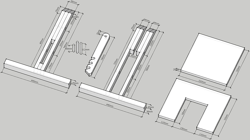 - نضع الألواح المعالجة ، باستخدام مسامير ذاتية التنصت وغراء الخشب ، نربطها (نضعها مع الجانب العريض على سطح الطاولة) بعوارض عرضية ، في نهاياتها يتم عمل قواطع للأرجل.