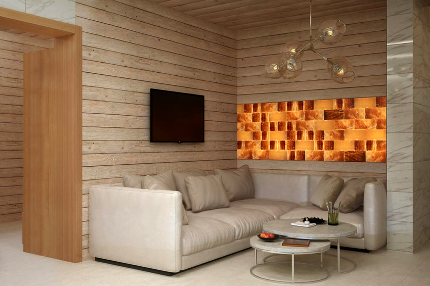 في الحمامات ذات الحجم المتواضع ، غالبًا ما يتم دمج غرفة الاسترخاء مع غرفة تغيير الملابس. في مثل هذه الحالات ، تعمل الشاشة الخشبية المزينة بشكل فني ، المتناغمة مع الأثاث الرئيسي ، بشكل مثالي كقسم وتزين الغرفة.