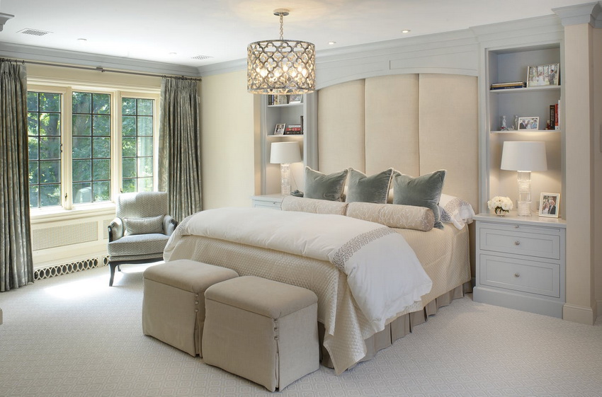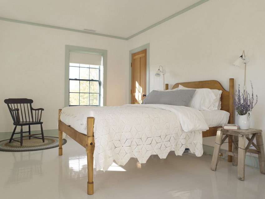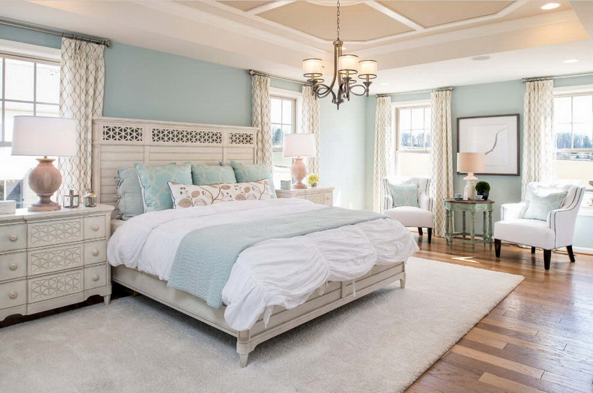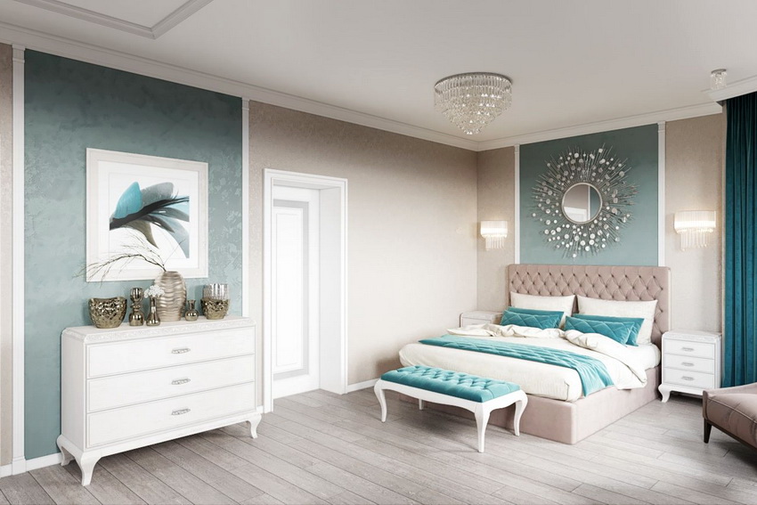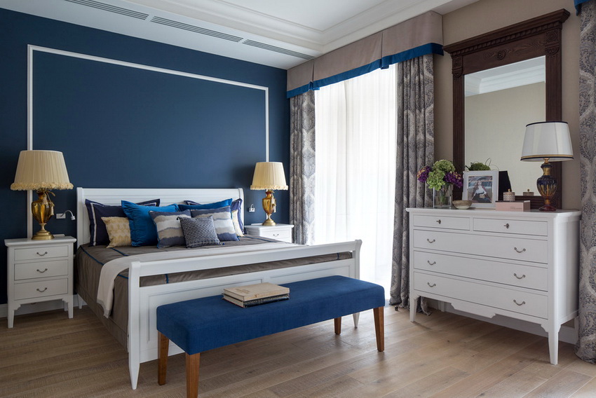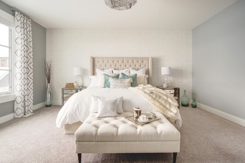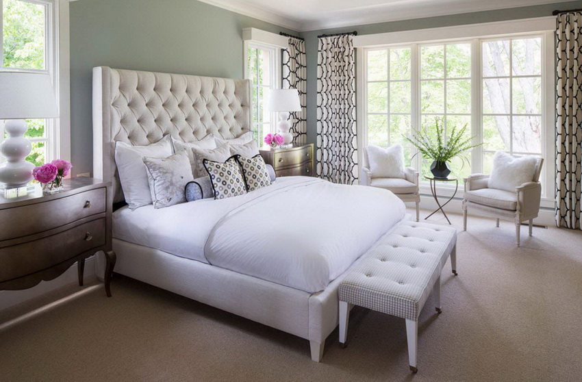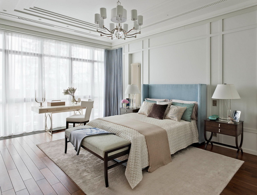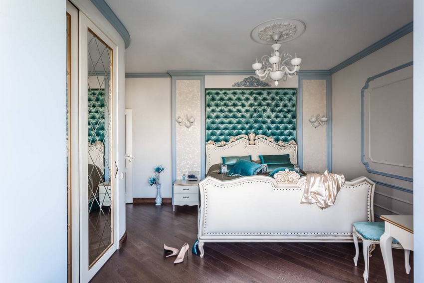 يمتزج اللون الأبيض تمامًا مع جميع درجات اللون الأزرق والأخضر والبيج ، مما يسمح لك بإنشاء تصميمات داخلية فاخرة لغرفة النوم