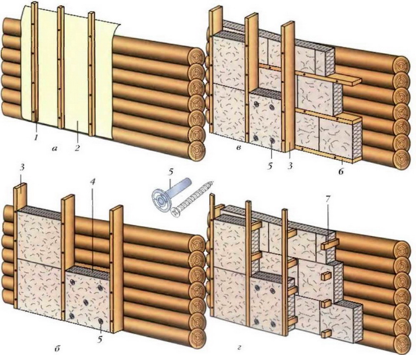 Базалтовата вълна, която е прикрепена към повърхността на стените с помощта на самонарезни винтове, е най-подходяща за изолиране на къща от бар. Монтажите трябва да бъдат позиционирани в размер от 4-6 броя на 1 m². Отгоре трябва да се постави дифузионна мембрана, която действа като хидроизолационен агент.
