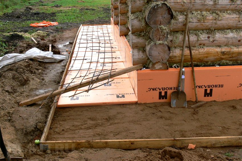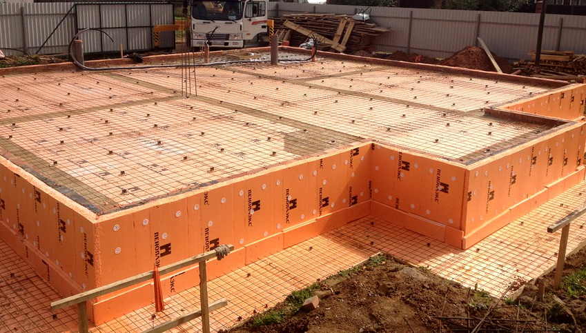 Остава само да се запълни основната част на основата, която предвижда задължителното присъствие на подсилващи елементи и се извършва съгласно стандартната технология. След като бетонът се втвърди напълно, плочите от експандиран полистирол се прикрепват към всички крайни части с помощта на специално лепило.