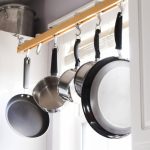 Допълнително място за съхранение в малка кухня може да се осигури чрез инсталиране на държач за тенджера и тиган над работната маса