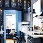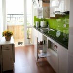 - вратата е друг елемент, който заема място в кухнята. Като решение на този проблем можете да инсталирате вратата така, че да се отваря навън или да вземете плъзгаща се конструкция;