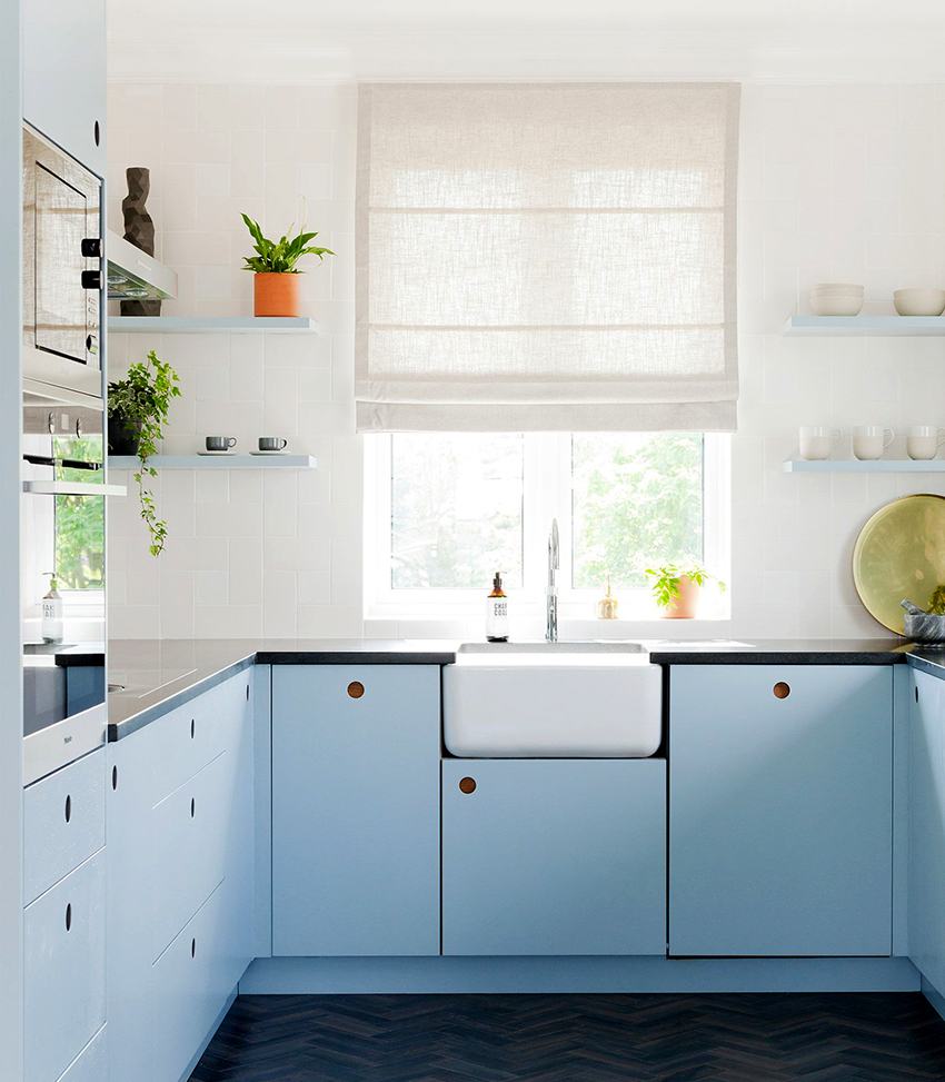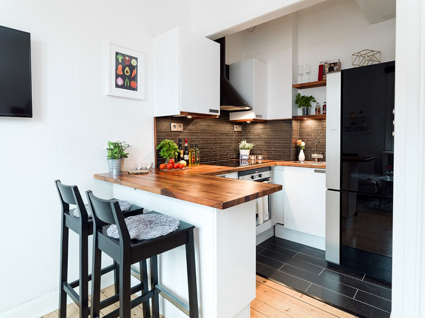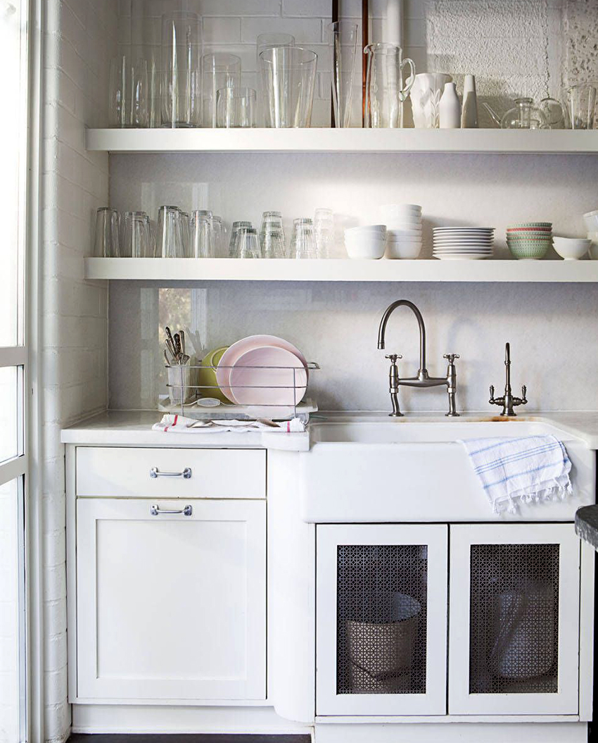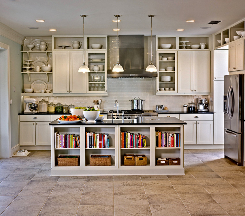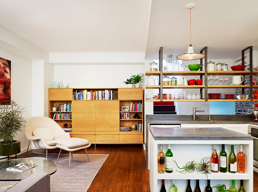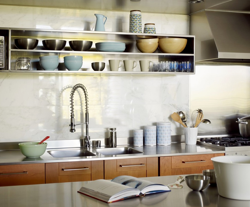 Отворените рафтове заемат по-малко място и не ограничават кухненското пространство. Това предимство е много важно, тъй като стандартните кухни се характеризират с проблеми с използваемото пространство.