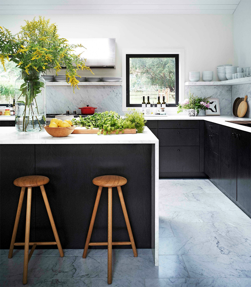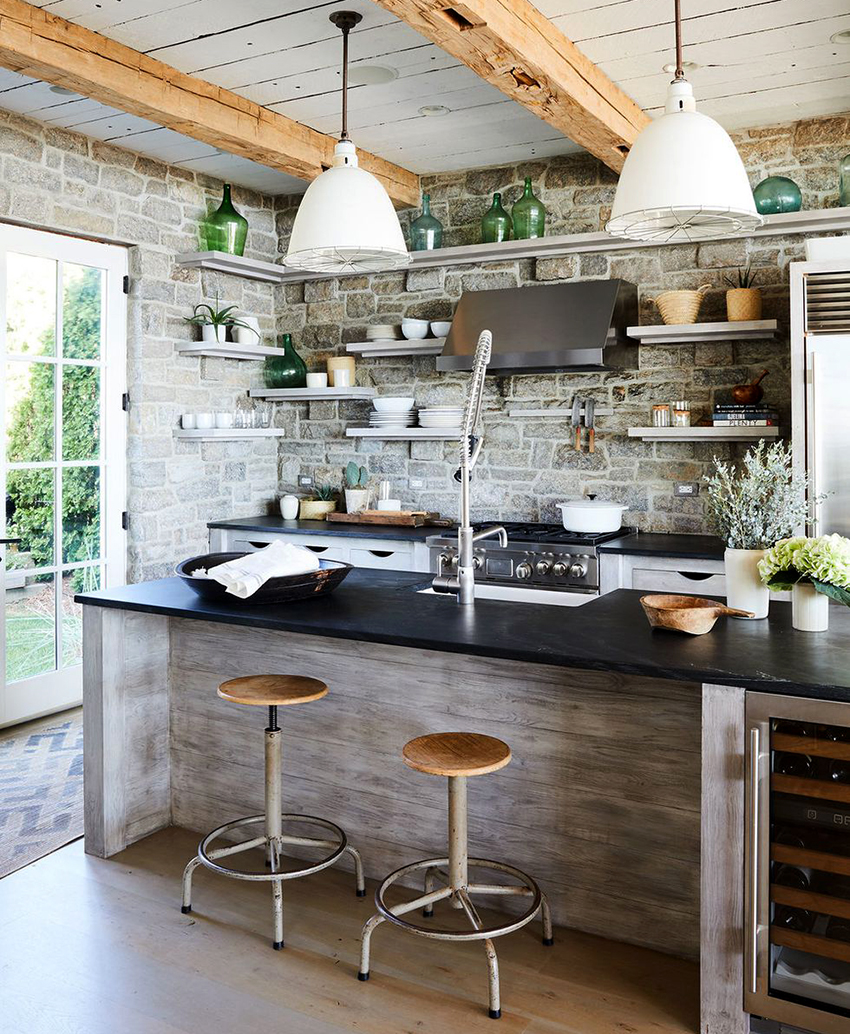 Камък (изкуствен и естествен). Рафтовете от този материал изглеждат солидни и масивни във вътрешността на кухнята. При самостоятелно сглобяване на такива конструкции е необходимо да се осигури тяхната надеждна фиксация, тъй като те са доста тежки. Слабите крепежни елементи може да не поддържат масите на каменни рафтове. Идеалното място за такива продукти е по-близо до пода. Цената на каменните мебели е доста висока, така че те са рядкост. Снимките от този тип рафтове ви позволяват да оцените техния стилен външен вид.