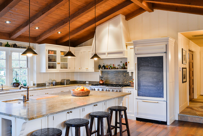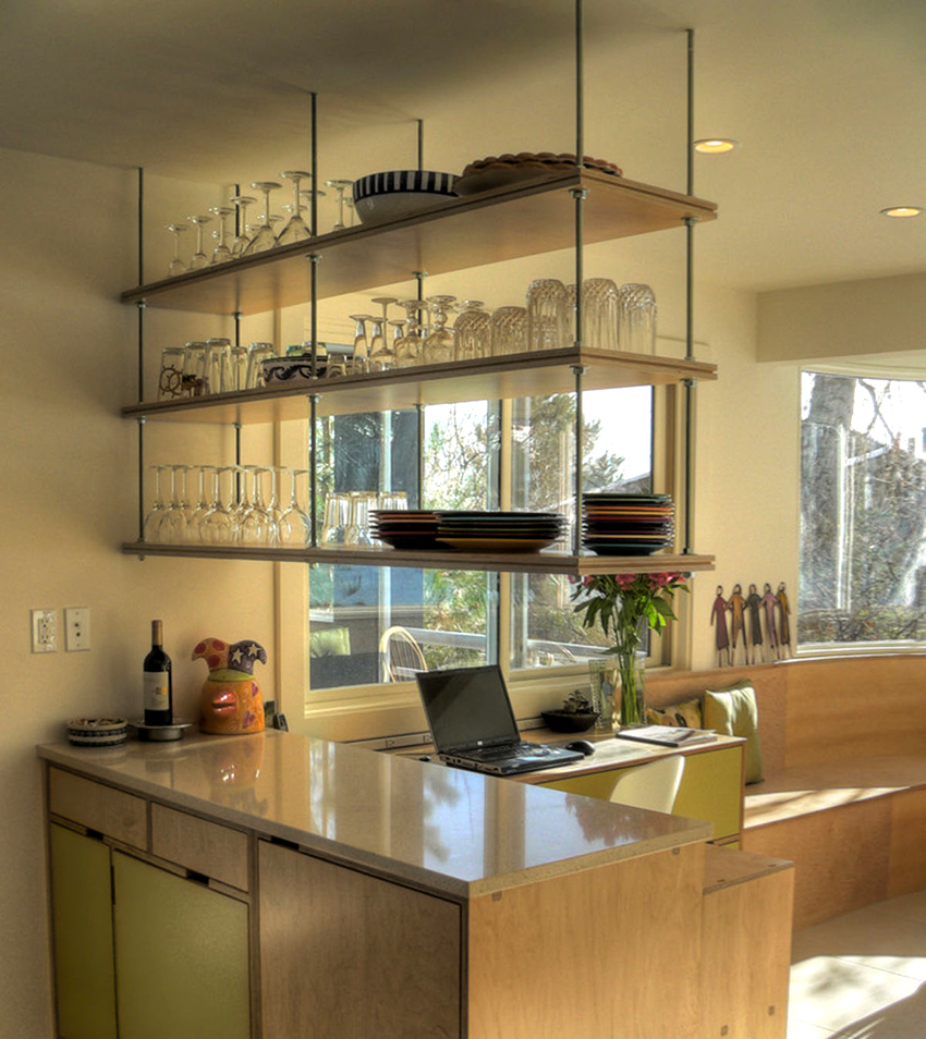 Преди да закупите този дизайн, препоръчително е да проучите техните снимки. Кухня с отворени рафтове, фиксирани към тавана, изглежда по-просторна, така че има смисъл да купувате такива продукти, за да спестите място в малки стаи.