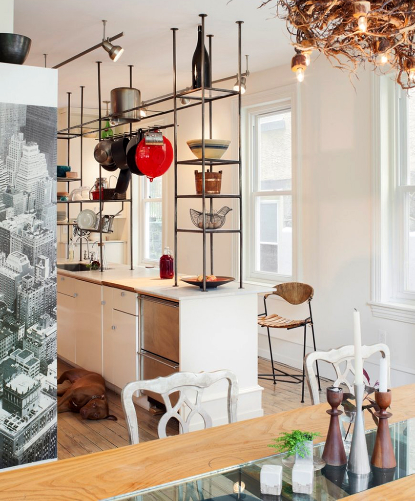 Освен това стелажите често се използват за зониране на пространството. Например дървена конструкция може да бъде разположена, за да отдели трапезарията от зоната за готвене. Моля, имайте предвид, че тази опция е подходяща само за просторни и средни кухни. Малките помещения не трябва да се разделят на зони, тъй като те нямат достатъчно място. За малка кухня може да се закупи ъглова стелажна единица.
