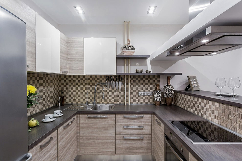 Долната повърхност на отворените конструкции може да бъде оборудвана с лампи, които ще осветяват зоната за готвене. Прожекторите изглеждат страхотно в модерните кухни.