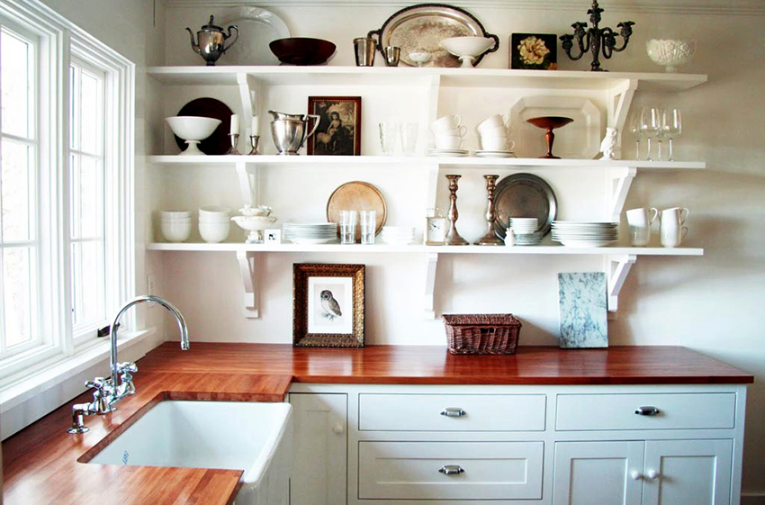 Едно от основните предимства на тези рафтове е, че те са универсални. Такива дизайни са подходящи за различни стилове. Отворените рафтове в кухнята могат да бъдат инсталирани в стая, направена в класически стил, държава или в по-модерен, например, минимализъм.