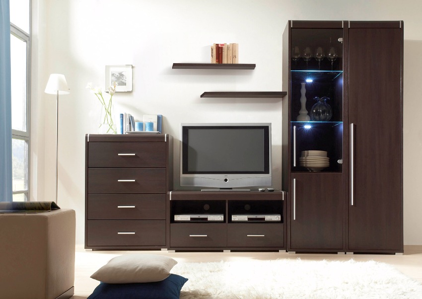 Важно! Ако стената е инсталирана в спалнята под телевизора, е необходимо да се гарантира, че устройството не е разположено близо до стената или фасадата. Телевизор с лошо вентилирана задна стена постоянно ще се прегрява и бързо ще се повреди.