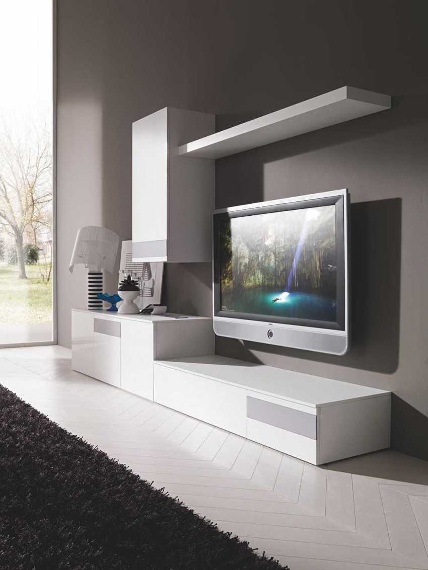 Ако планирате да инсталирате ъглова стена под телевизора, тогава трябва да го поставите така, че телевизорът да е разположен срещу леглото, под минимален ъгъл, в резултат на което ще бъде удобно да гледате програми, без да ставате от леглото си. Инсталирането на стена с телевизор може да се обмисли и в тясна спалня. В този случай трябва да се даде предпочитание на плитка, но широка структура.