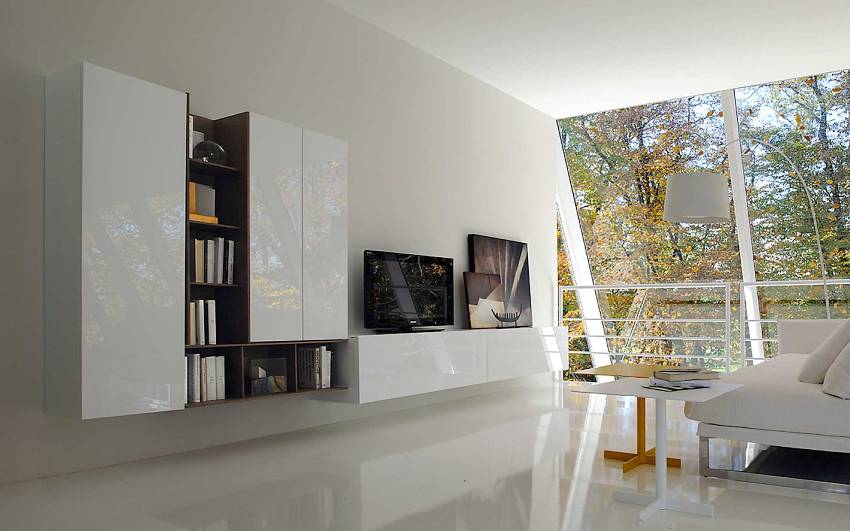 - Висока технология. При избора на цвят на стената се предпочитат сивите, сребърните, белите и черните тонове. Фасадите на продукта са лъскави и лъскави, по мебелите няма дръжки, отварянето става чрез натискане на повърхността на фасадата с помощта на системата "Push to Open". Насърчава се наличието на вградени осветителни елементи.