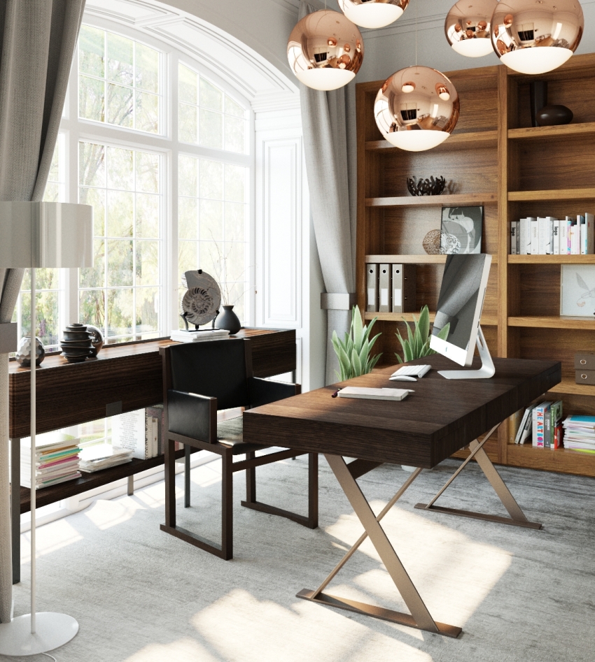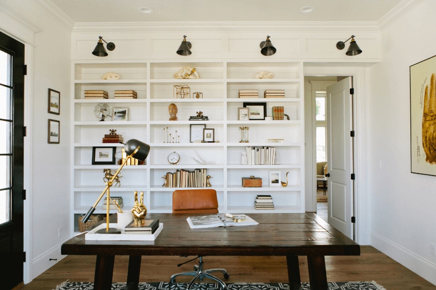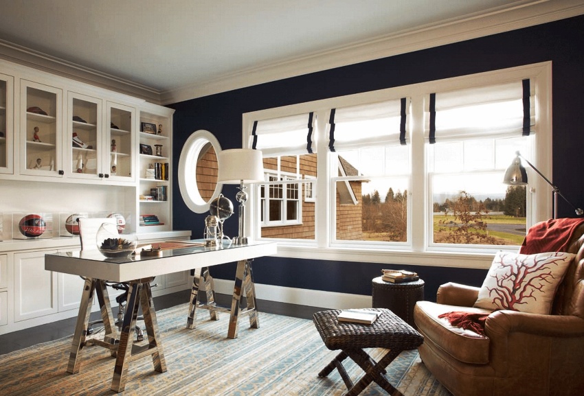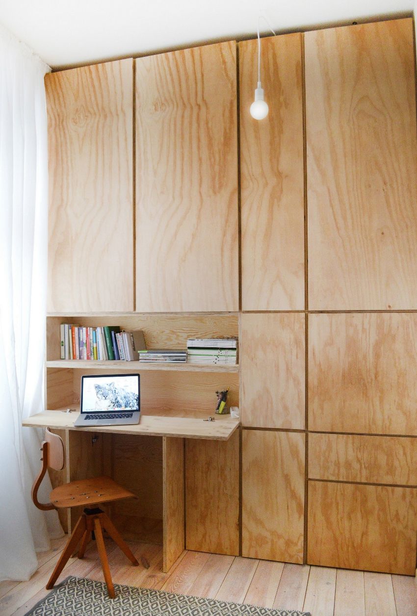 Друга възможност за модулни мебели е стена с място за компютърно бюро. По-добре е да инсталирате комплекта от лявата страна на прозореца, така че работното място да е добре осветено през деня. В резултат на това ще бъде не само удобно да работите на компютъра, но можете да използвате това място и за четене или писане.