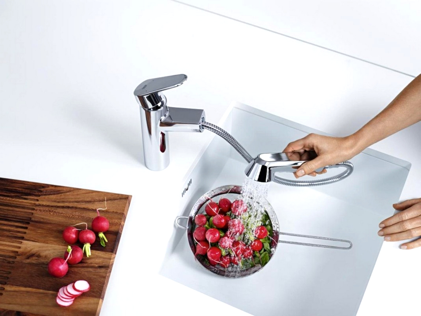 Такива смесители са удобни, когато има две или повече купи, тъй като те могат да доставят вода на отдалечено разстояние и под всякакъв ъгъл. Използването на прибиращ се маркуч от този дизайн е просто: просто направете просто движение с една ръка.