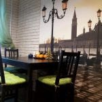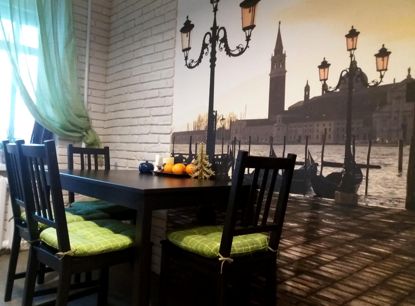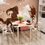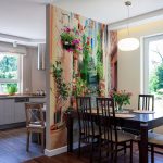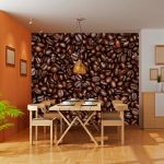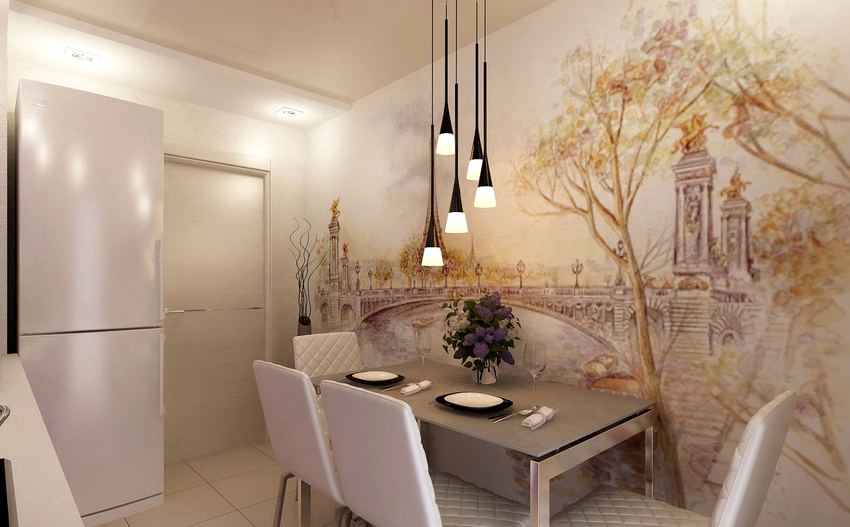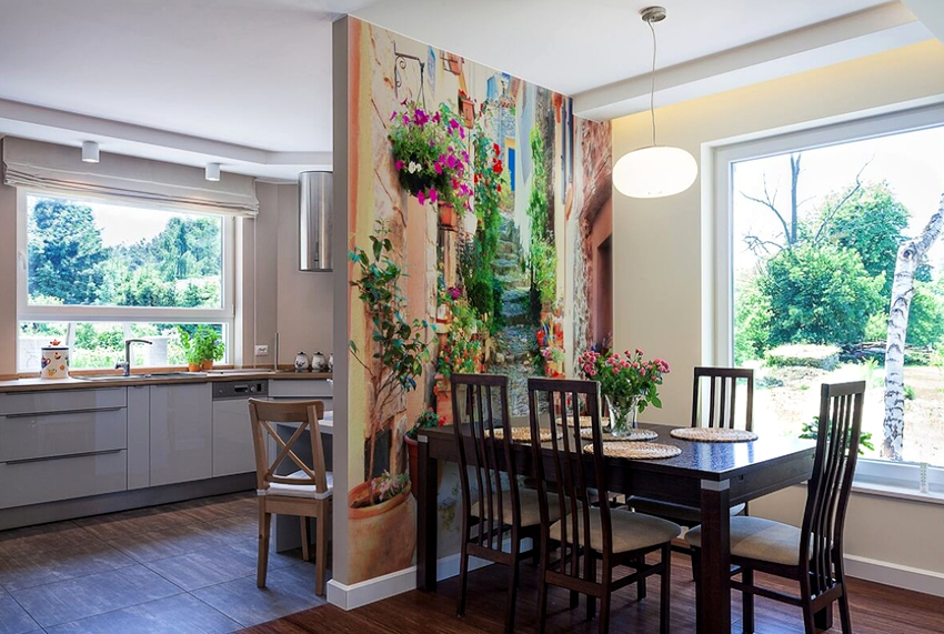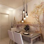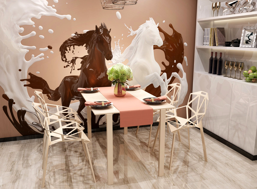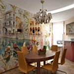 Красивите тапети или пейзажи ще бъдат чудесно допълнение към стената в трапезарията. В този случай се препоръчва да подредите мебели по такъв начин, че да не припокрива чертежа. Също така е важно да съответства на стила на тапета в интериора. Само в случай на правилно нанасяне на фототапети можете да постигнете отличен резултат. Многобройни снимки в интернет ще ви помогнат да изберете най-добрия вариант.