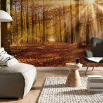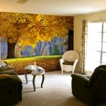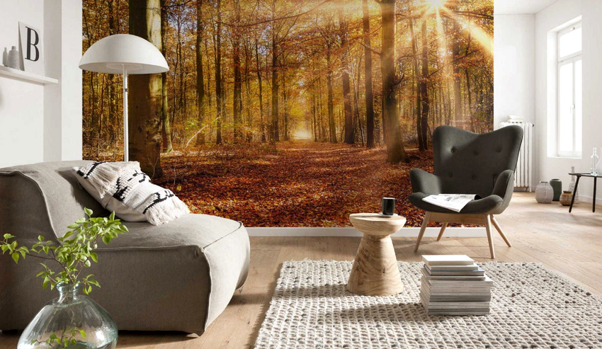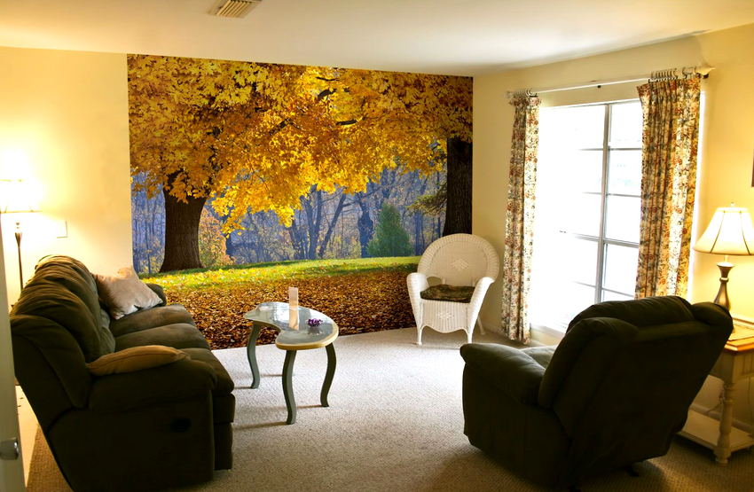 Полезен съвет! Топлите цветове в интериорните пейзажи създават приятелски отношения, поради което те се препоръчват за хола. Ярък пример е фотографски пейзаж на есенен парк или тапети слънцето.