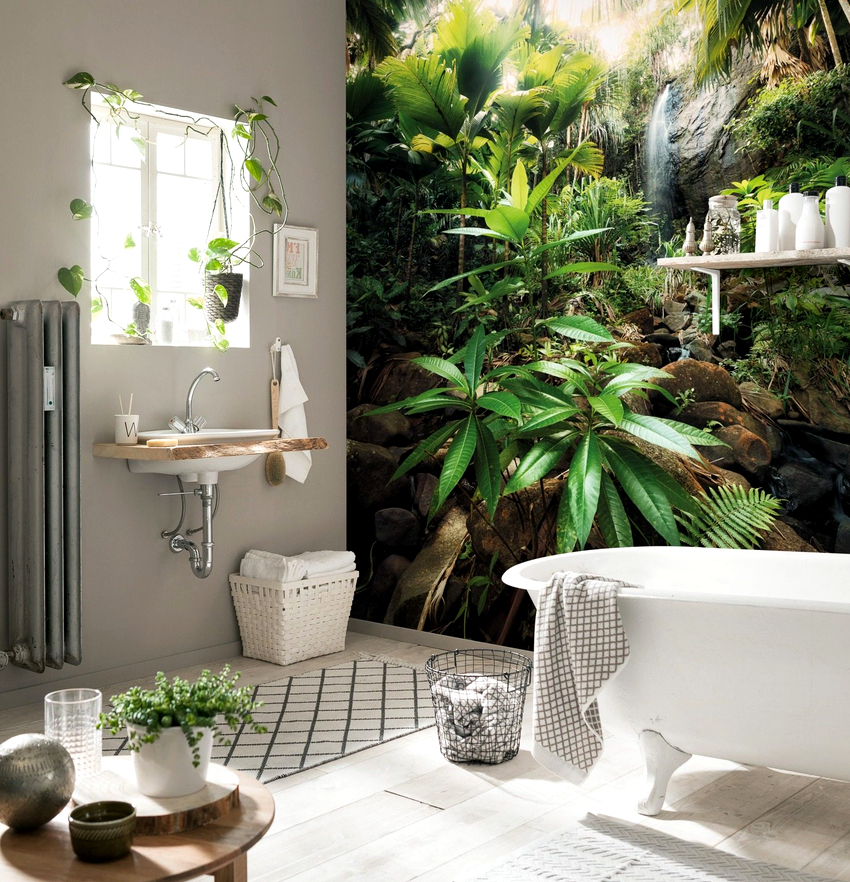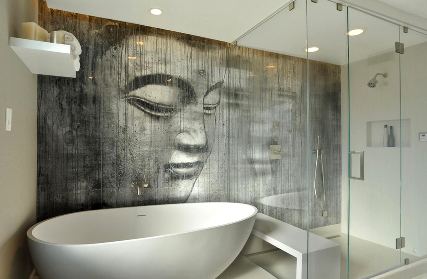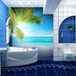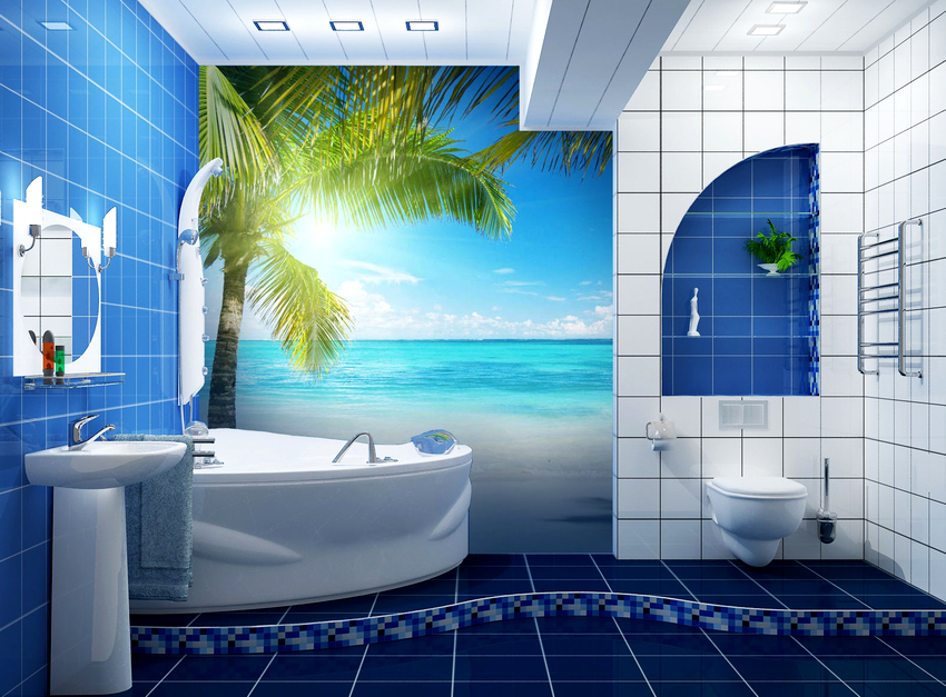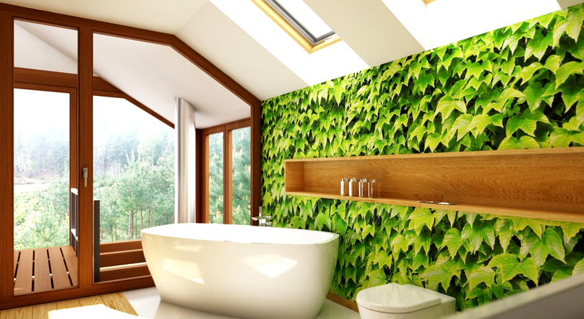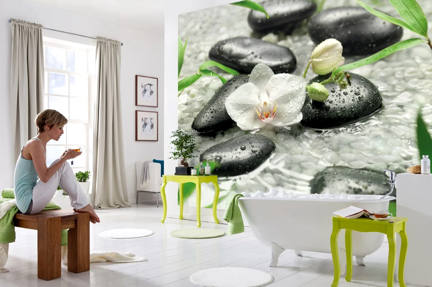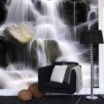 В коридора фототапетите не само ще украсят стените, но и ще допринесат за визуалното разширяване на пространството. Фотопечатът ще създаде същия ефект в банята. Изображенията на водопад изглеждат особено красиви, но в стая с висока влажност е по-добре да използвате плочки с приложено изображение, а не хартиени тапети.