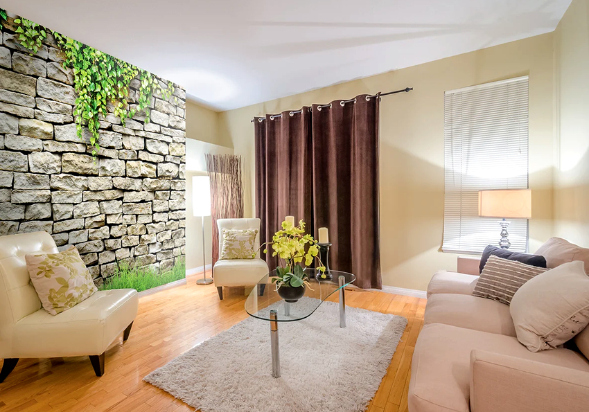 За малки стаи е препоръчително да изберете лека палитра. Вертикалните картини ще допринесат за визуалното удължаване на стаята във височина, а хоризонталните картини ще разширят пространството. Текстурираните дизайни, които имитират камък, дърво или тухла, могат да създадат илюзия за естествени материали, като същевременно запазват ценно пространство.