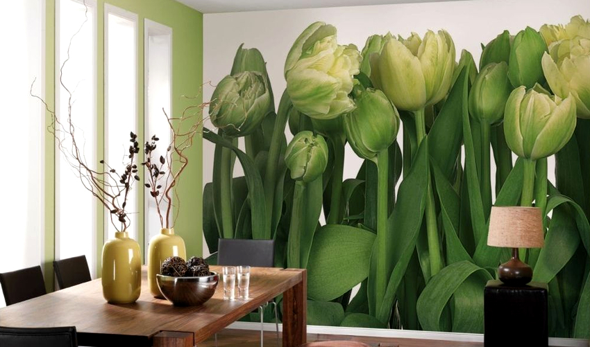 Освен това едва ли можете да намерите друг вид цвят, който да има същата разнообразна цветова палитра. Дизайнерите препоръчват да се даде предпочитание на светлите тонове тапети, върху които цветна картина ще привлече вниманието, без да ви притеснява. По-добре е да използвате друго обзавеждане или декор като ярки елементи.