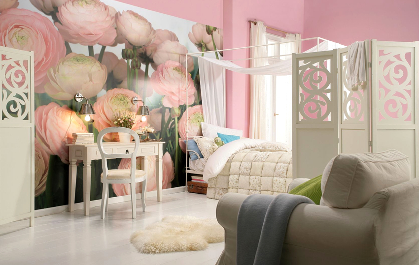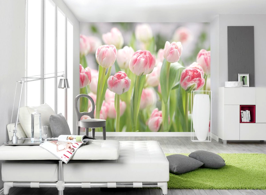 - фото тапети цветя в интериора на различни стаи е една от най-популярните модерни теми: те са подходящи за хола, за детската стая и за спалнята;