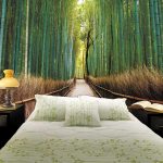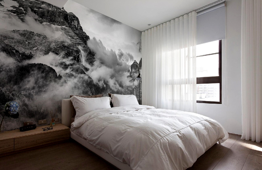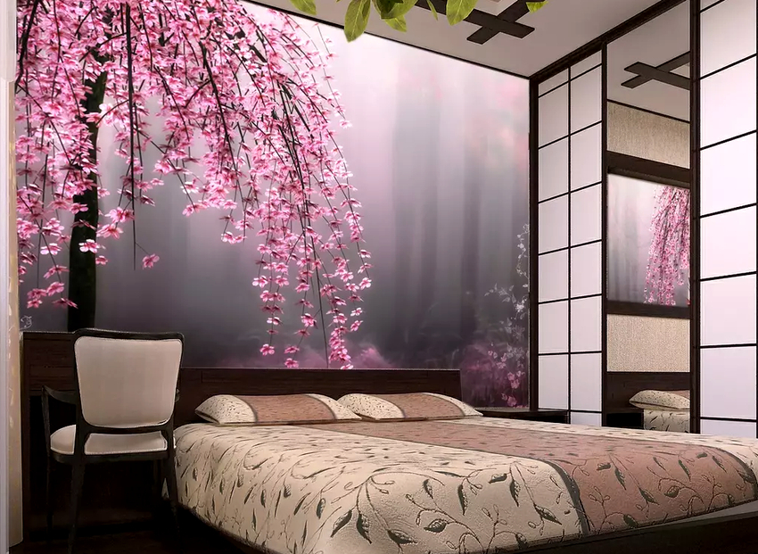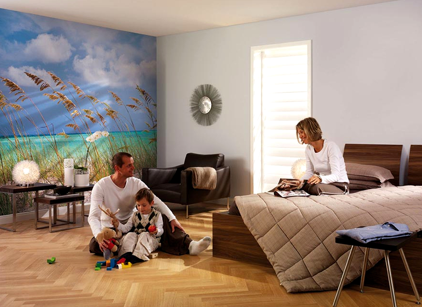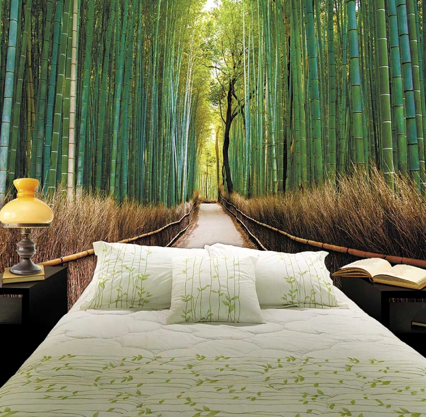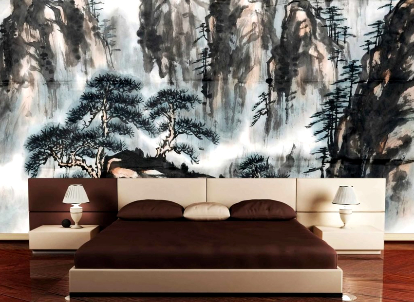 Тапет в спалнята най-често се поставя над главата на леглото. Платната визуално го отделят от останалото пространство, като по този начин обозначават зоната за сън. Освен това фотографското изображение може да се превърне в красиво и хармонично продължение на таблата на леглото.
