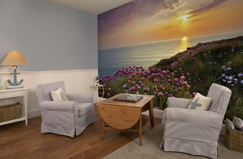 Репродукциите на морски художници като Айвазовски, Куинджи и Репин са в съответствие както с класическия, така и с морския стил. Любителите на морето могат да направят фотоснимки по поръчка, като изберат желания сюжет на съответната тема. Тапетът, изобразяващ разпененото море, нежни камъчета или морски залез, ще внесе свежест и уют в хола.