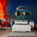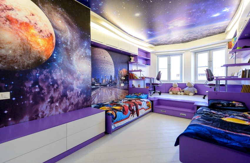 Космическата тема е по-малко популярна в сравнение с видовете декорация на помещения, изброени по-горе, но това е само въпрос на време, както уверяват дизайнерите. Тапетът с космос олицетворява мистерията и безкрайността на Вселената, подтиквайки човек да мисли, което допринася за релаксация и бърз сън. Ето защо такива тапети най-често се купуват за декориране на спални и детски стаи.