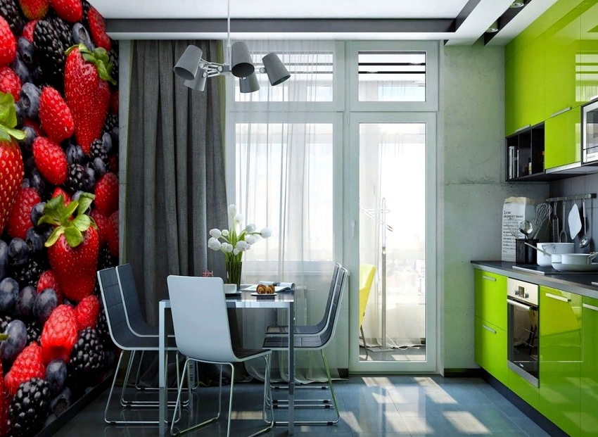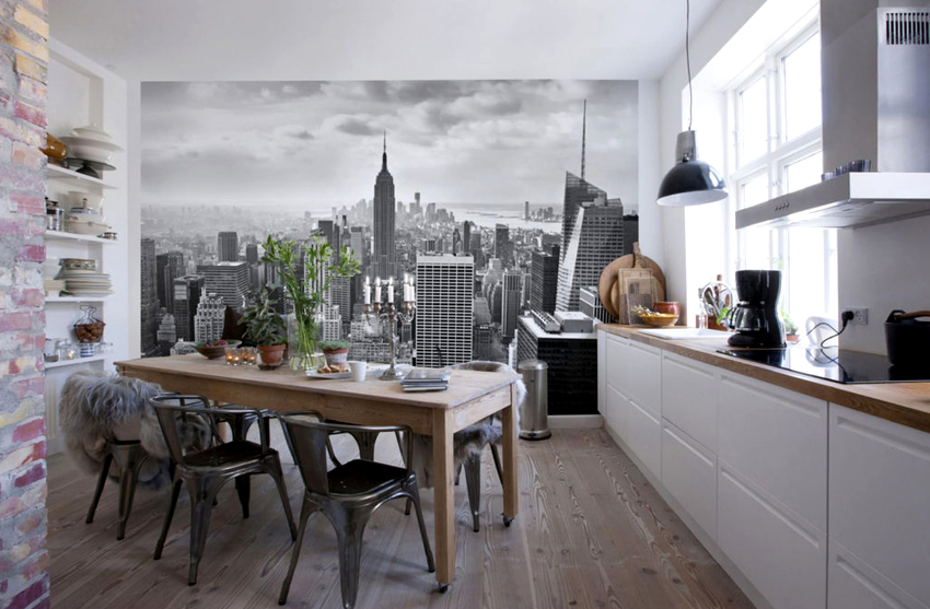 В съвременните кухни най-често се използват стенописи под формата на кожи, които се поставят в зоната на престилката. Тази опция за декориране на работната зона с красиви черно-бели рисунки на нощния град или снимки на сочни плодове и плодове е много популярна напоследък. В просторни кухни можете да украсите трапезарията с фототапет.