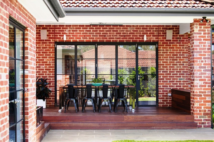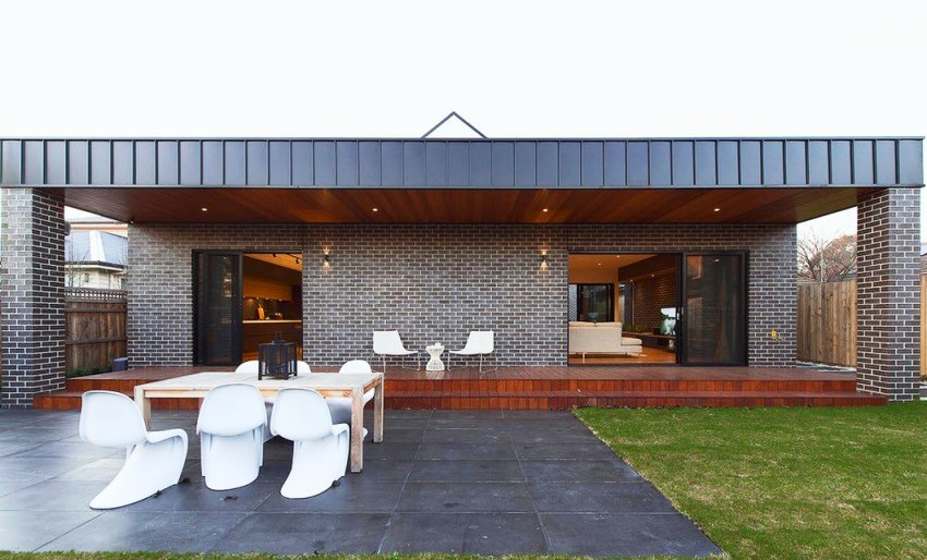 Колоните на терасата могат да бъдат трансформирани с облицовъчни тухли. Къщите от този материал с удължители от този тип са подходящи и за възрастни хора. Както вече споменахме, терасата може да бъде отворена или затворена. В първия случай остъкляването е изключено: площадката е разположена на открито под навес. Доста често такива тераси се комбинират с барбекю и скара.