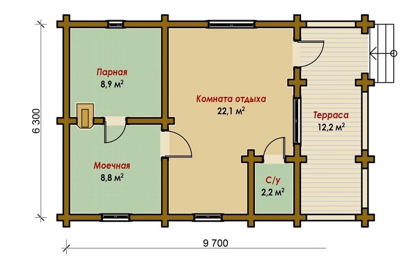 Полезен съвет!При изграждането на баня с стая за почивка е необходимо да се осигури преддверие или съблекалня на входа от улицата. Това ще предотврати навлизането на студен въздух в стаята през зимата.