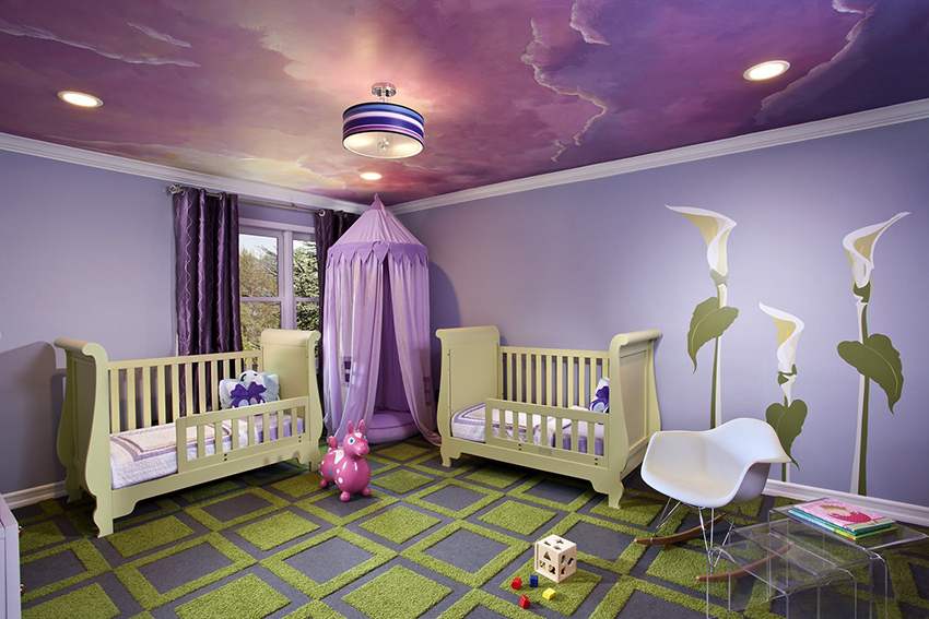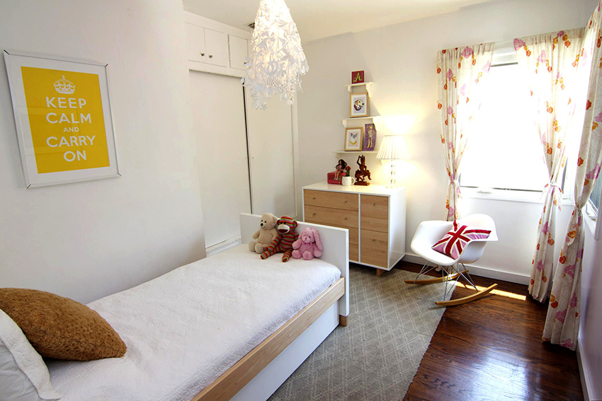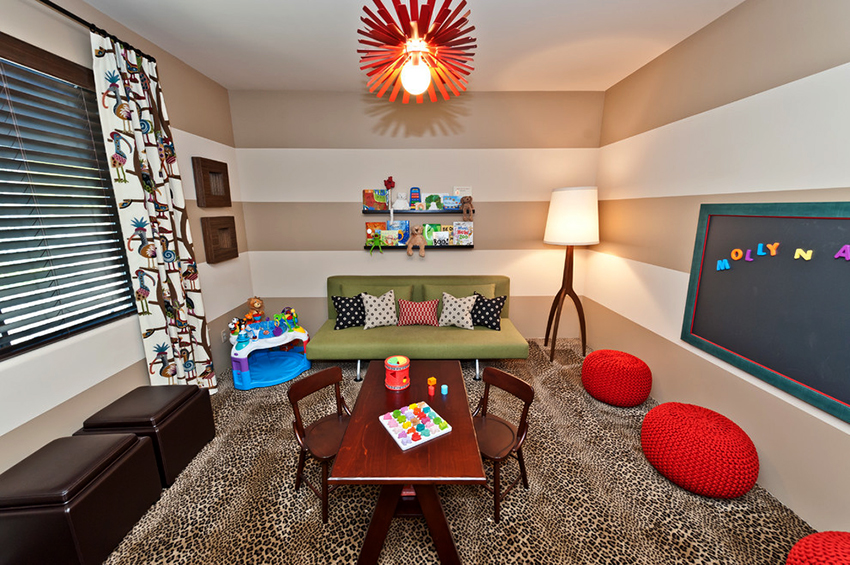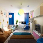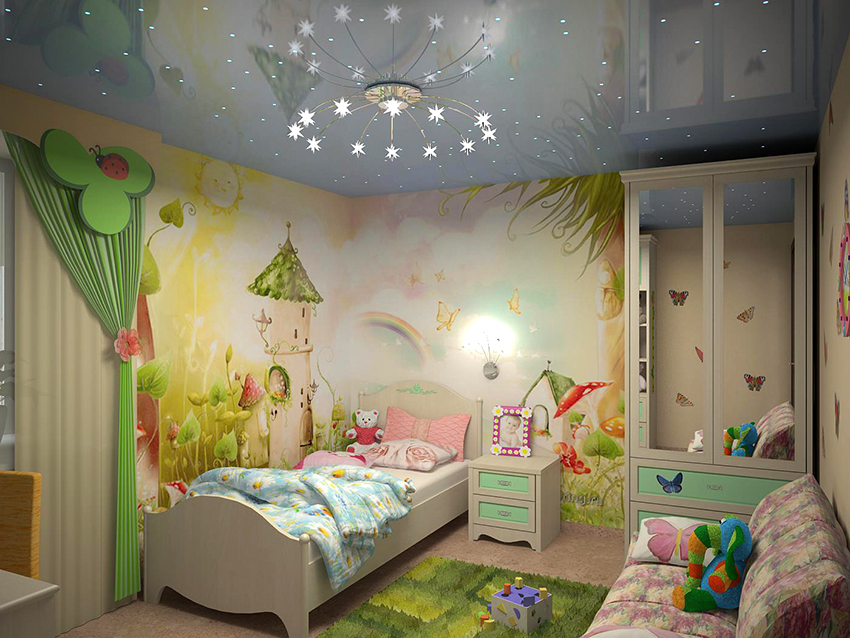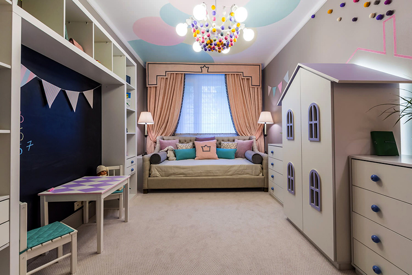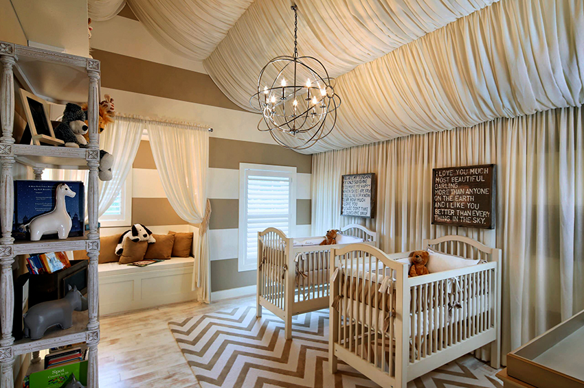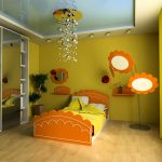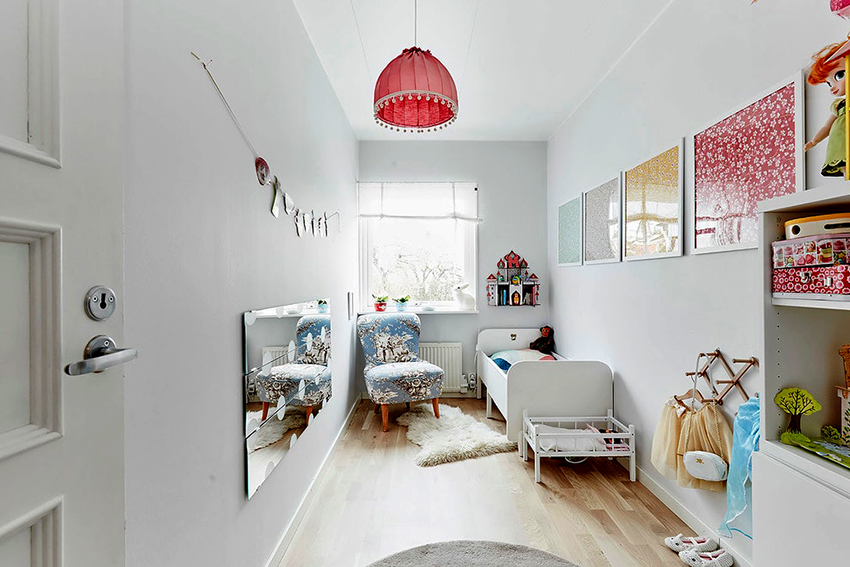 La planificació de molts edificis residencials no va tenir en compte inicialment la necessitat d’una habitació infantil. Per tant, sovint s’hi assignen habitacions aleatòries, les dimensions de les quals són bastant modestes. Amb sostres baixos, inferiors a 230 cm, molta gent prefereix no fer servir un llum d'aranya per il·luminar. Aquesta decisió és un error, ja que és el llum del sostre el que crea una sensació de volum i amplia visualment l’espai. Sense aranya, l’interior d’una sala d’estar pot semblar inacabat.