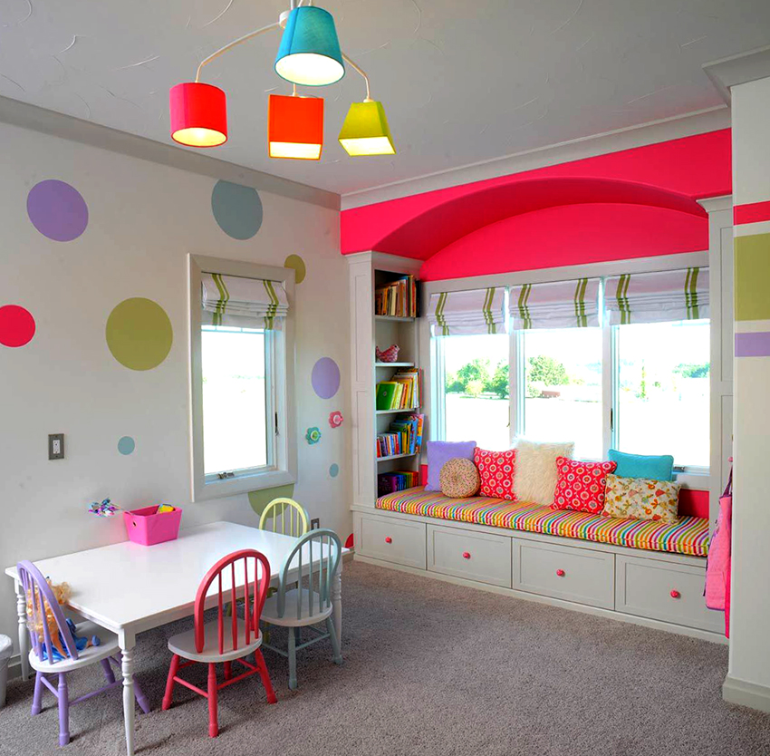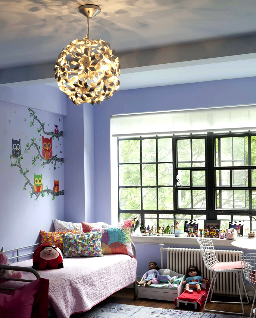 Tradicionalment, l’aranya té una posició central al sostre. Pel que fa a la il·luminació de l'habitació infantil, és molt adequat i aconsellable des del punt de vista de la seguretat i la higiene utilitzar aquest tipus de làmpades a la zona de jocs. Un nen d’educació infantil dibuixa i escriu en una taula petita, sobre la qual cau la llum des de dalt. A través llum de taula i un dispositiu de paret no pot crear les condicions necessàries.