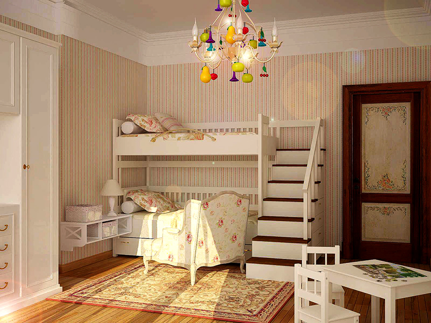 Un consell útil! Per a habitacions infantils de petita alçada, és millor triar llums d’aranya de vidre o plàstic. Les de fusta semblaran voluminoses.