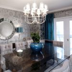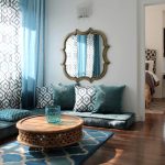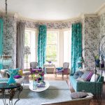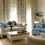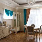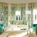 Les cortines de color turquesa combinades amb volants daurats o marró beix a la part inferior del llenç decoraran l’interior de la sala d’estar d’una manera original. Les gruixudes cortines de color blau fosc seran molt més originals amb un volant curt curt fet del mateix teixit, adornat amb vellut o trena clara.