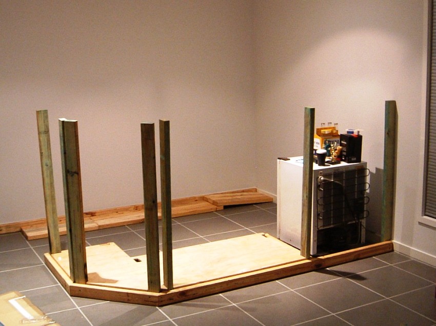 - Instal·lació de potes de suport i bigues transversals per al muntatge de sobretaula. La seva alçada es determina de manera que el taulell quedi al mateix nivell que la zona de treball de la cuina.