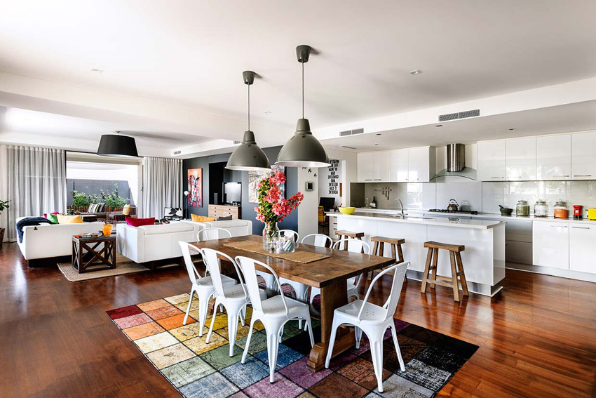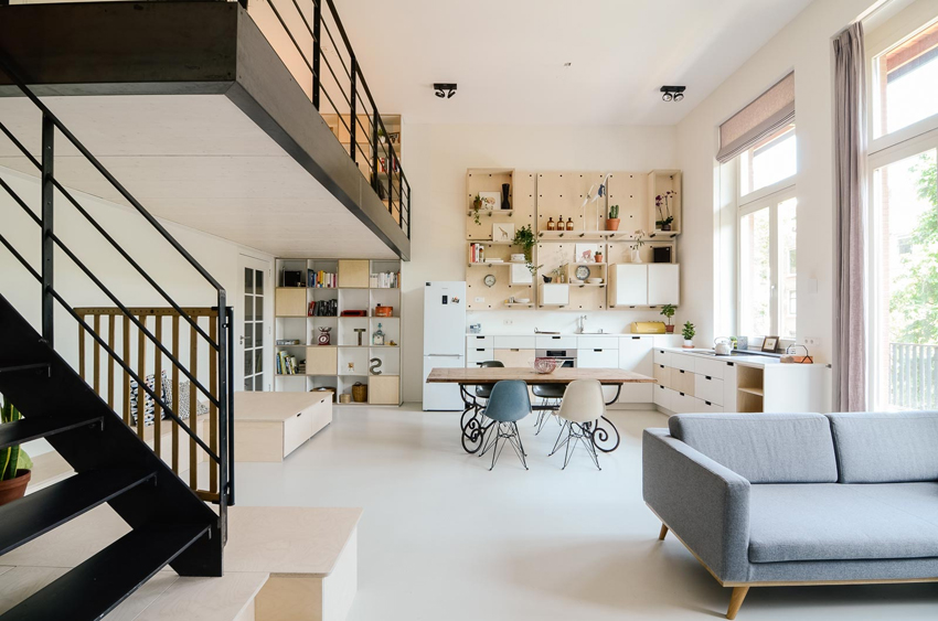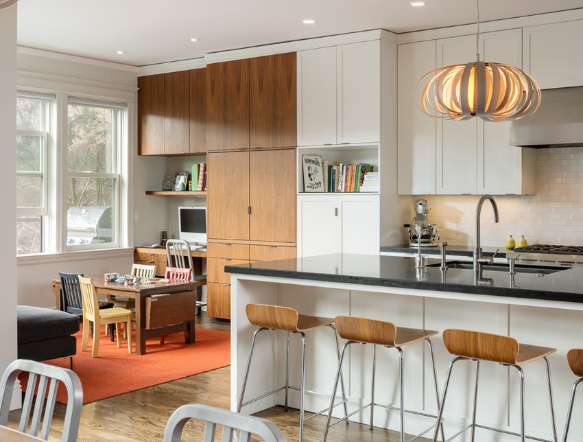 La combinació d’espais de sala d’estar, cuina i menjador és una solució de planificació habitual a les cases modernes. Aquesta tècnica permet abandonar portes i envans interiors a la zona comuna. El resultat és un ampli estudi de planta oberta.