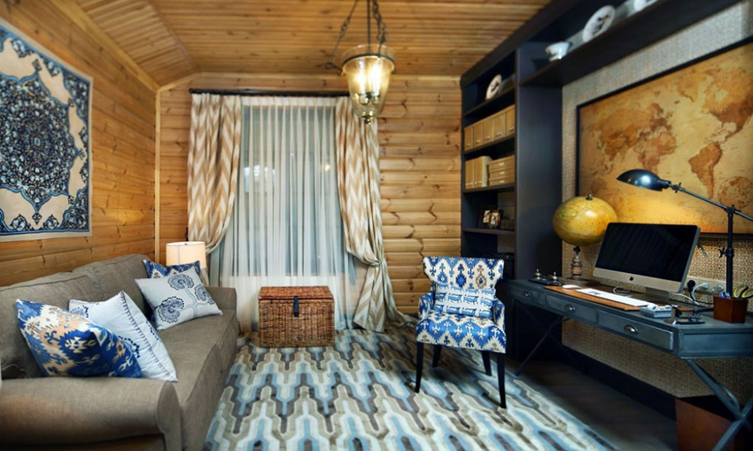 En el disseny d'una casa de camp a l'interior, podeu utilitzar altres tècniques de zonificació, per exemple, col·locant catifes que difereixen en color o forma en diferents àrees. Es permet l’ús de diversos tipus d’acabats al terra i a les parets. El més important és que no es contradiuen massa.