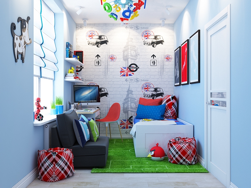 Com a decoració, heu de col·locar models de cotxes de carreres, soldats, personatges de les vostres pel·lícules preferides. A les parets, podeu col·locar elements com: