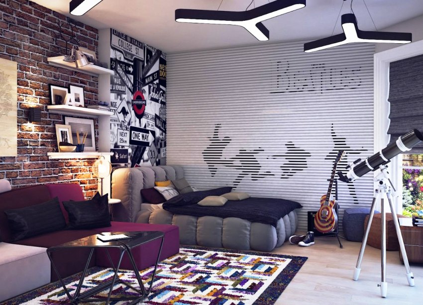Una habitació d’adolescent d’estil loft hauria de reflectir principalment el món interior del nen. Per tant, és important crear no només un interior que s’adapti a l’estil general de l’apartament, sinó també un entorn on el nen estigui còmode. Es recomana que el nen triï independentment el fons de pantalla i seleccioni els colors per a la decoració de les parets.