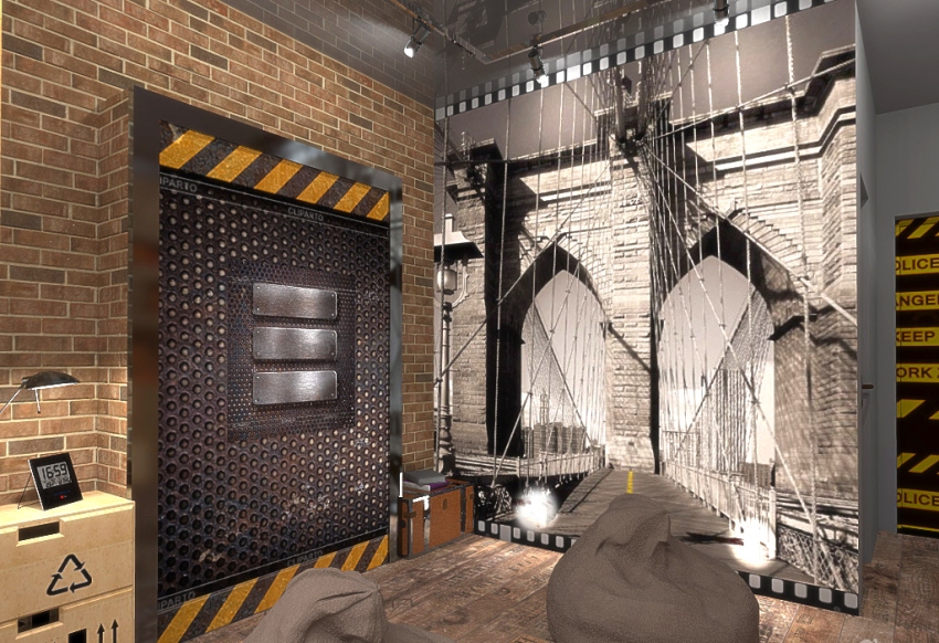 Habitació per a adolescents d'estil loft decorada amb imatges de superherois, cotxes retro, rètols de trànsit, vitralls
