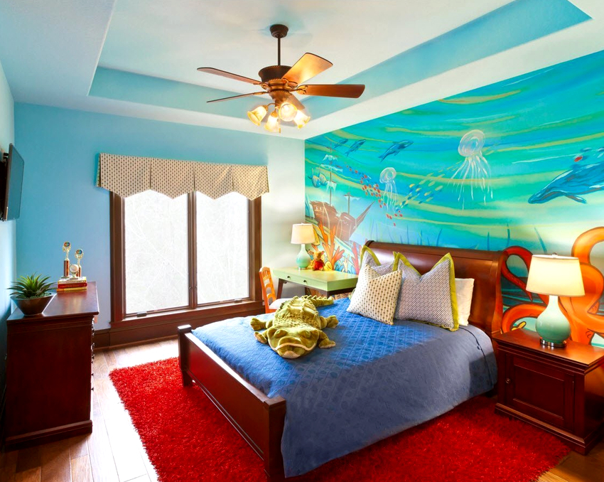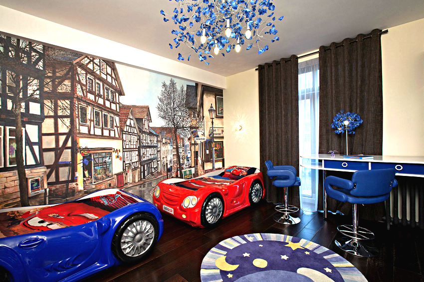 Blau. El color és profund i saturat. Una abundància de tons blaus al dormitori infantil pot provocar un estat d’ànim apàtic i trist. Per tant, si es va decidir utilitzar paper fotomural amb elements de color blau, cal diluir-los amb tons càlids.