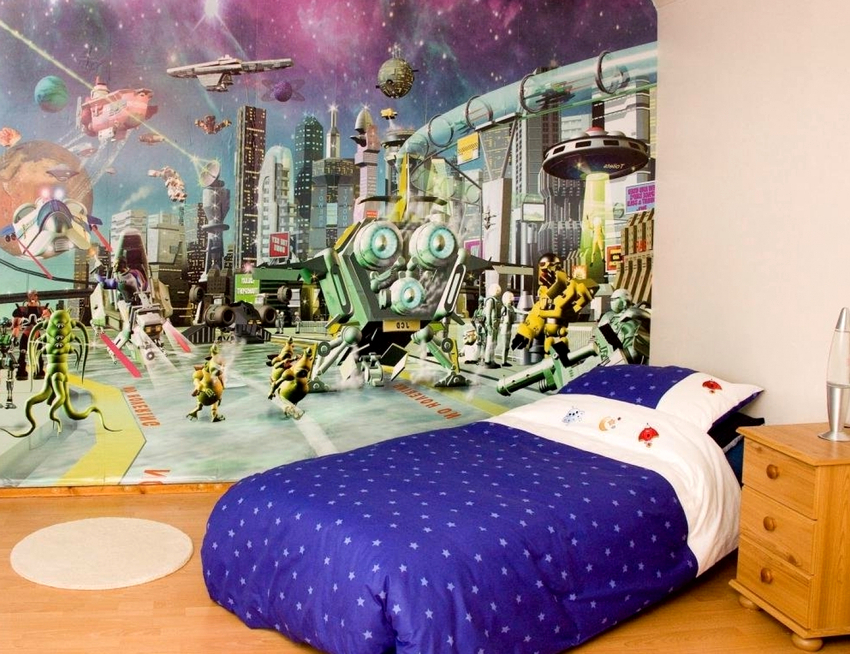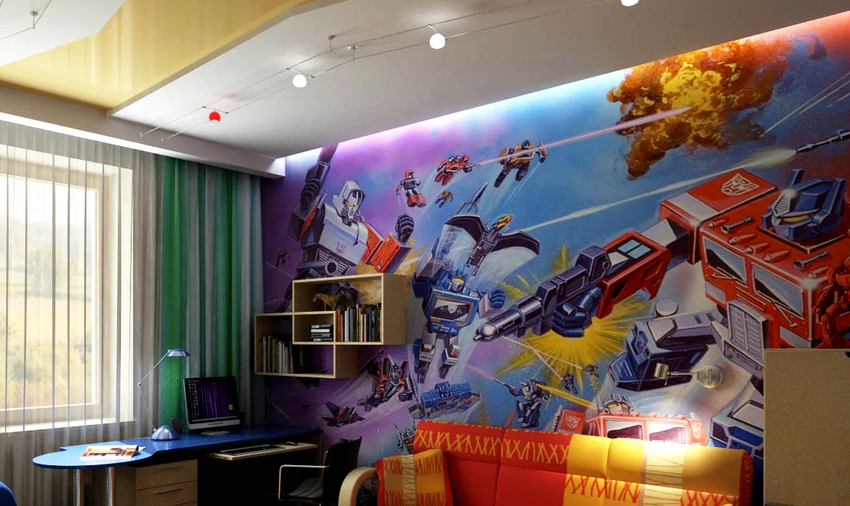Fotomural Transformers a l'habitació infantil també és adequat d'utilitzar, sobretot si es tracta del còmic preferit d'un noi. Cal tenir en compte que normalment les imatges amb aquests personatges són força fosques, de manera que podeu triar un petit fragment de la paret per fer una imatge de la trama i fer que la resta de l’habitació sigui més brillant i alegre.
