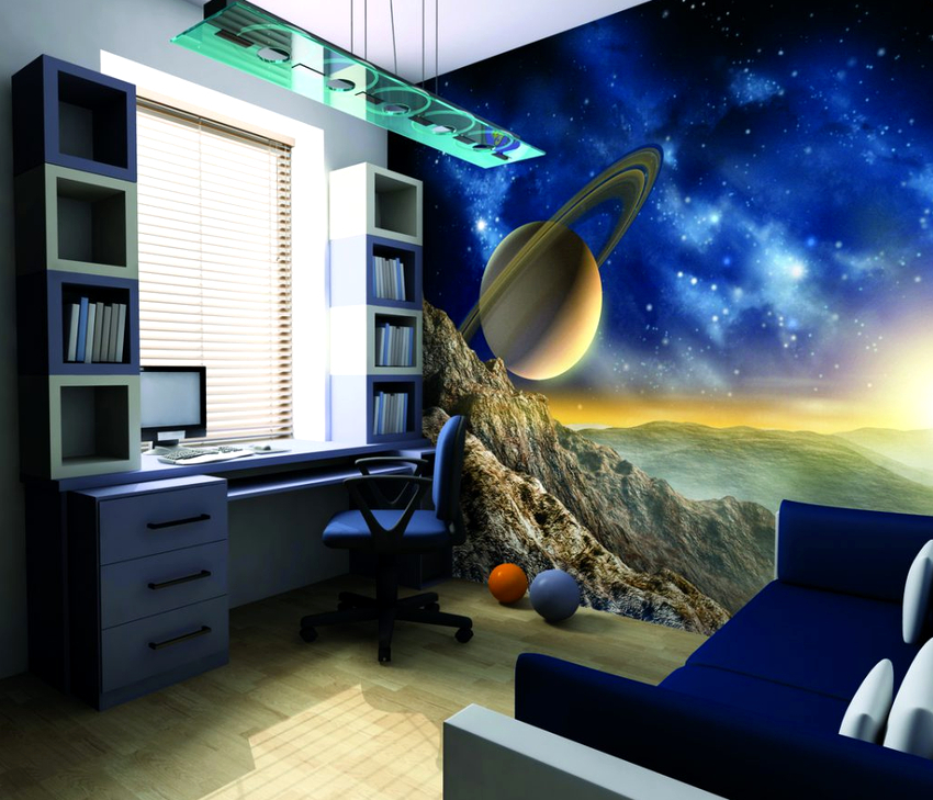 - Espai.Una versió popular del fons de pantalla infantil per a nens que es senten atrets pel tema de l’espai i que es desenvolupa cada vegada més. Podeu utilitzar opcions per a fons de pantalla amb efecte de resplendor, que crearan una imatge realista del cel estrellat i lunar. És adequat utilitzar aquest paper pintat per decorar el sostre.