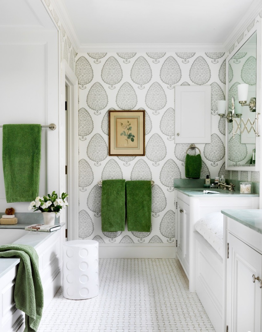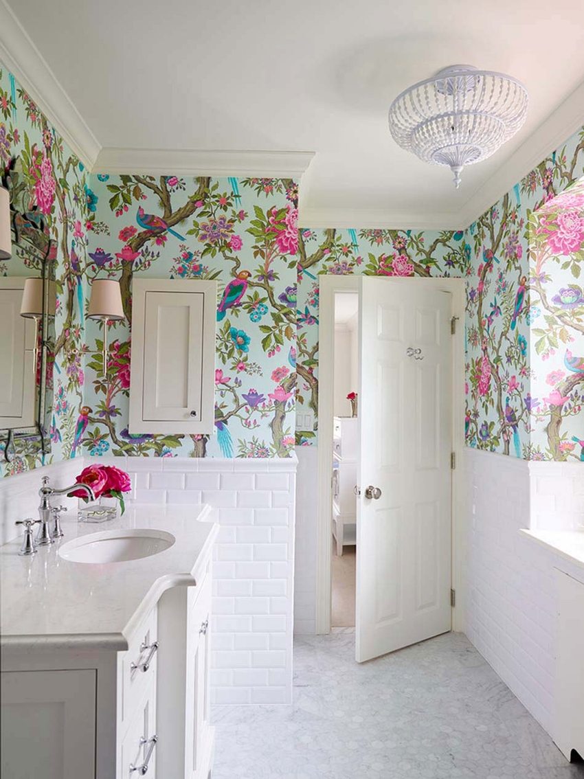 Els tons més brillants del paper pintat s’han de combinar amb colors neutres per obtenir un interior harmoniós i una estada còmoda al bany